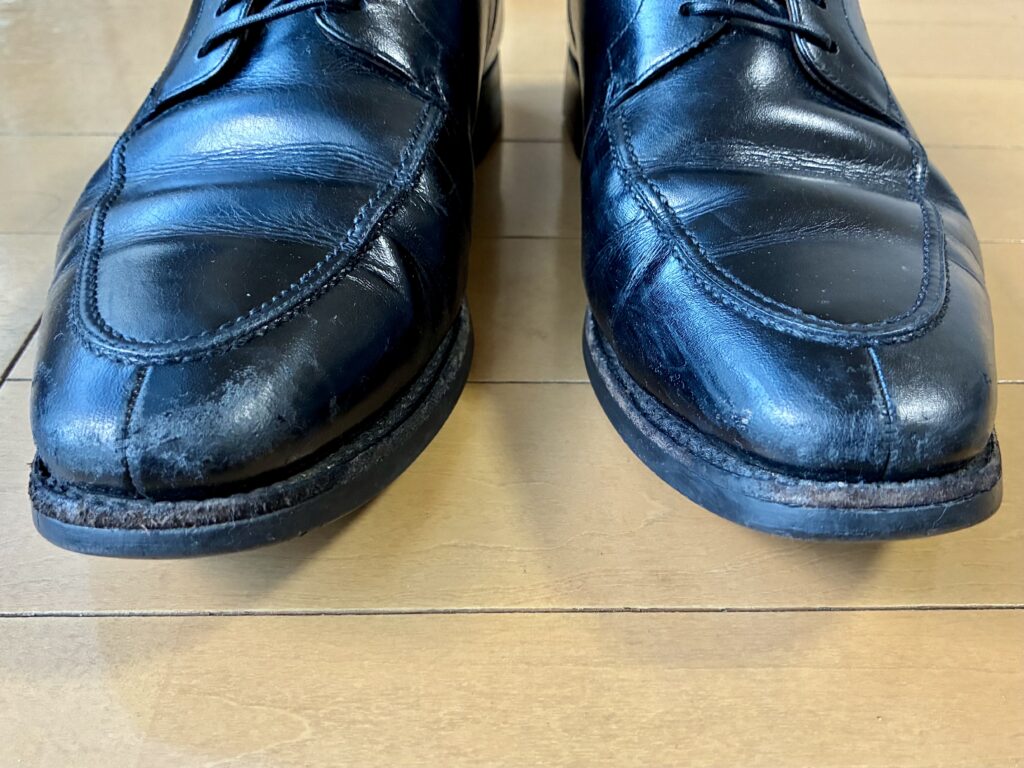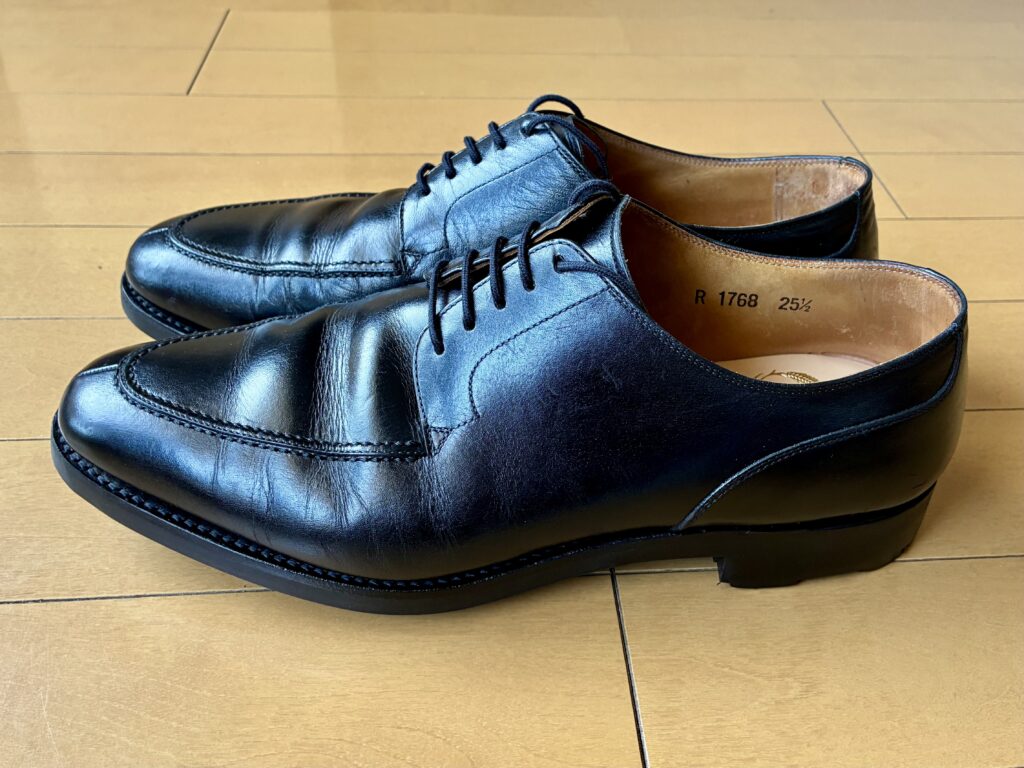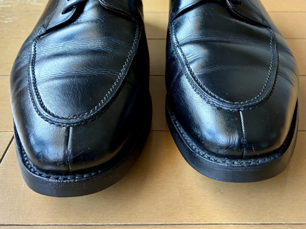 今回オールソールに出したのは、10年間愛用してきた「スコッチグレイン」の黒の外羽根Uチップのシューズ。佐野プレミアムアウトレット内のストアで購入したものだ。確か当時で22,000〜25,000円くらいだったと思う。