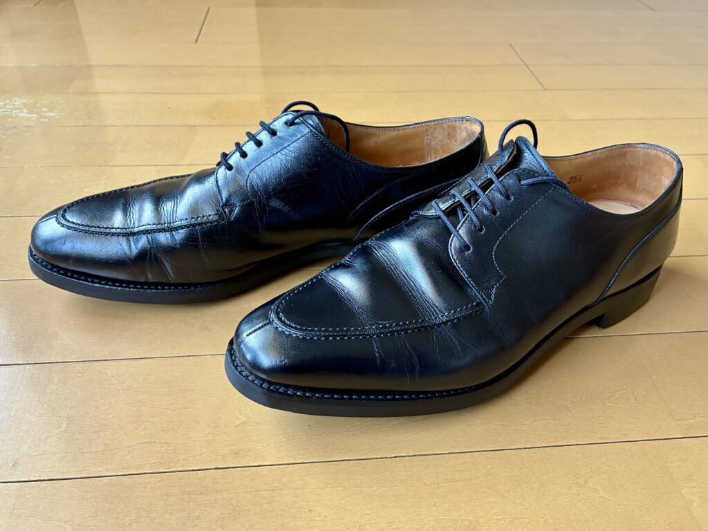 今回オールソールに出したのは、10年間愛用してきた「スコッチグレイン」の黒の外羽根Uチップのシューズ。佐野プレミアムアウトレット内のストアで購入したものだ。確か当時で22,000〜25,000円くらいだったと思う。